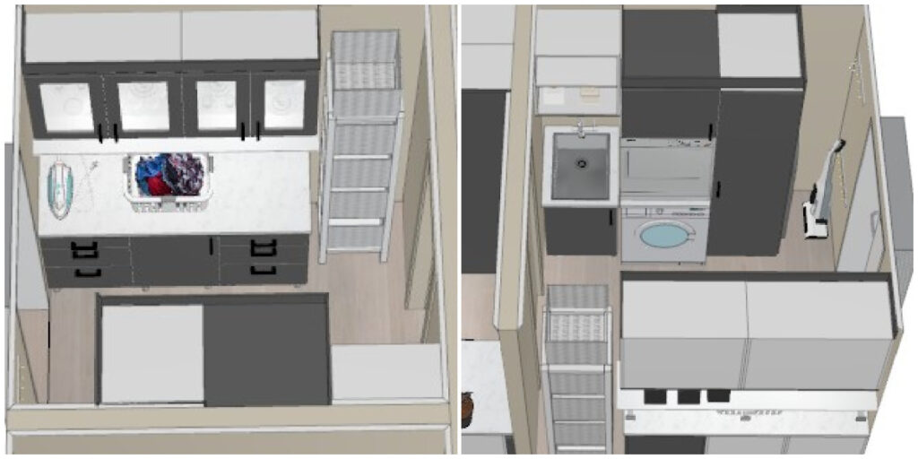 Slik kan dette alternativet bli med vask og oppvaskmaskin mot kortveggen, her i fugleperspektiv i tegneprogrammet.